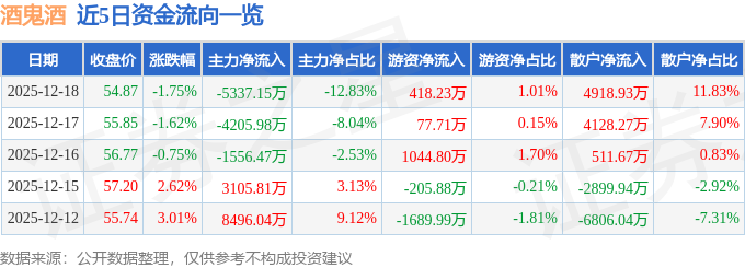证券之星消息,截至2025年12月18日收盘,酒鬼酒(000799)报收于54.87元,下跌1.75%,换手率2.32%,成交量7.54万手,成交额4.16亿元。