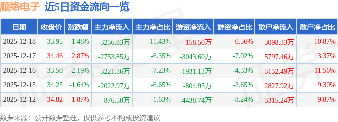 证券之星消息,截至2025年12月18日收盘,顺络电子(002138)报收于33.95元,下跌1.48%,换手率1.11%,成交量8.37万手,成交额2.85亿元。