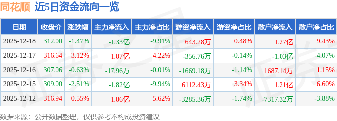 证券之星消息,截至2025年12月18日收盘,同花顺(300033)报收于312.0元,下跌1.47%,换手率1.56%,成交量4.29万手,成交额13.46亿元。