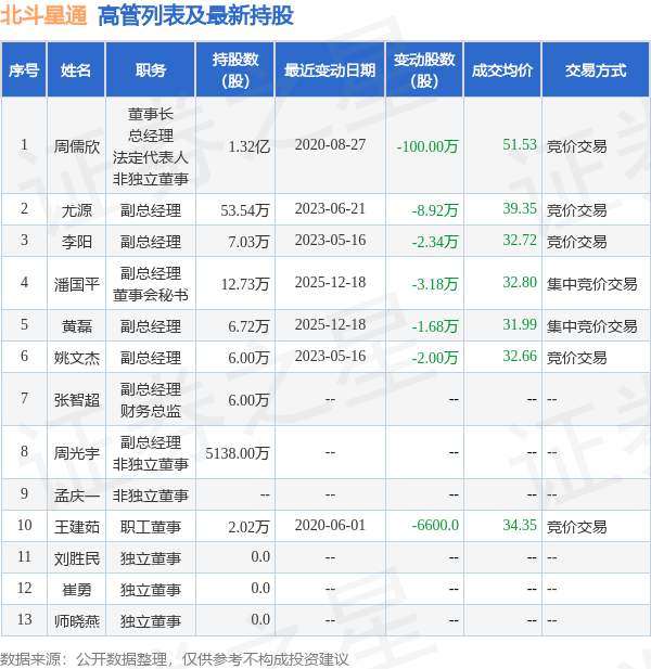 北斗星通的高管列表及最新持股情况如下: