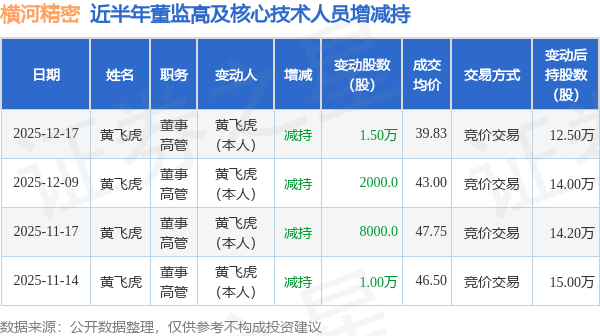 证券之星消息,根据12月18日市场公开信息、上市公司公告及交易所披露数据整理,横河精密(300539)最新董监高及相关人员股份变动情况:2025年12月17日公司董事,高管黄飞虎共减持公司股份1.5万股,占公司总股本为0.0056%。变动期间公司股价上涨2.76%,12月17日当日收盘报39.77元。