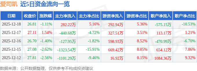 证券之星消息,截至2025年12月18日收盘,爱司凯(300521)报收于26.81元,下跌1.11%,换手率1.37%,成交量2.05万手,成交额5464.51万元。
