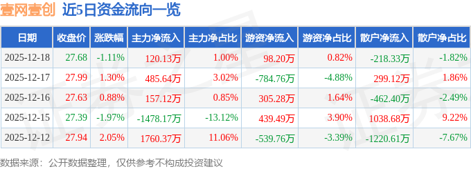 证券之星消息,截至2025年12月18日收盘,壹网壹创(300792)报收于27.68元,下跌1.11%,换手率2.02%,成交量4.3万手,成交额1.2亿元。
