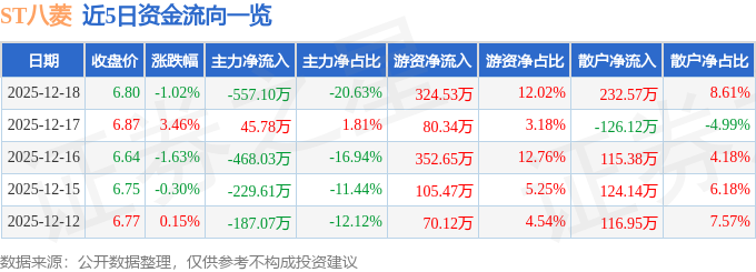 证券之星消息,截至2025年12月18日收盘,ST八菱(002592)报收于6.8元,下跌1.02%,换手率1.51%,成交量3.96万手,成交额2700.13万元。