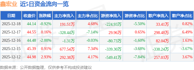 12月18日的资金流向数据方面,主力资金净流入191.51万元,占总成交额4.68%,游资资金净流出224.93万元,占总成交额5.5%,散户资金净流入33.41万元,占总成交额0.82%。
