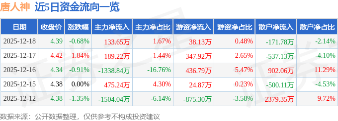 证券之星消息,截至2025年12月18日收盘,唐人神(002567)报收于4.39元,下跌0.68%,换手率1.27%,成交量18.22万手,成交额8017.71万元。