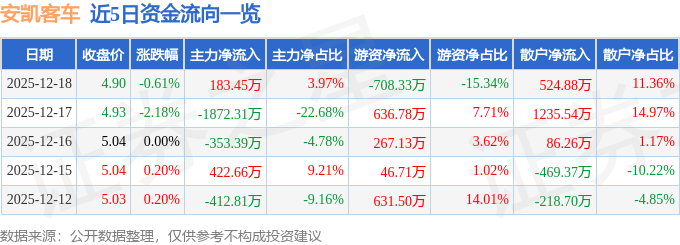 证券之星消息,截至2025年12月18日收盘,安凯客车(000868)报收于4.9元,下跌0.61%,换手率1.28%,成交量9.38万手,成交额4618.65万元。
