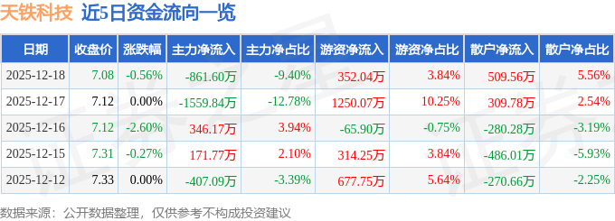 证券之星消息,截至2025年12月18日收盘,天铁科技(300587)报收于7.08元,下跌0.56%,换手率1.21%,成交量12.77万手,成交额9170.42万元。