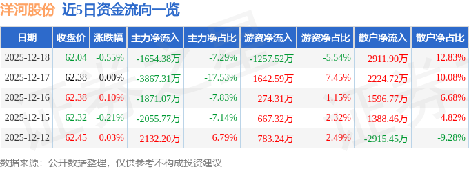 证券之星消息,截至2025年12月18日收盘,洋河股份(002304)报收于62.04元,下跌0.55%,换手率0.24%,成交量3.65万手,成交额2.27亿元。