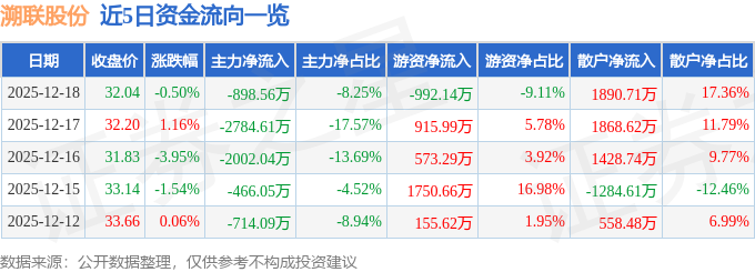 证券之星消息,截至2025年12月18日收盘,溯联股份(301397)报收于32.04元,下跌0.5%,换手率4.74%,成交量3.35万手,成交额1.09亿元。