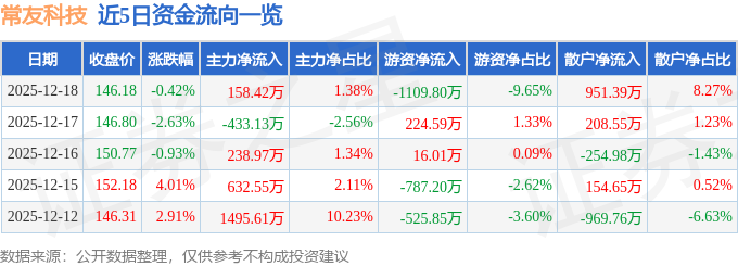 证券之星消息,截至2025年12月18日收盘,常友科技(301557)报收于146.18元,下跌0.42%,换手率6.99%,成交量7747.0手,成交额1.15亿元。