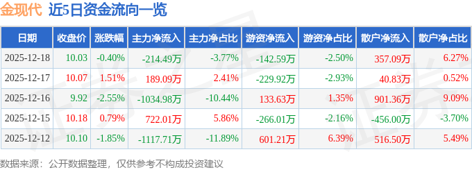 12月18日的资金流向数据方面,主力资金净流出214.49万元,占总成交额3.77%,游资资金净流出142.59万元,占总成交额2.5%,散户资金净流入357.09万元,占总成交额6.27%。