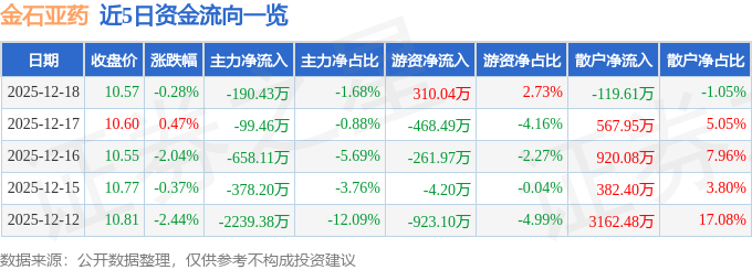 证券之星消息,截至2025年12月18日收盘,金石亚药(300434)报收于10.57元,下跌0.28%,换手率3.12%,成交量10.69万手,成交额1.14亿元。