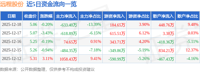 证券之星消息,截至2025年12月18日收盘,远程股份(002692)报收于5.06元,下跌0.2%,换手率1.3%,成交量9.3万手,成交额4731.93万元。