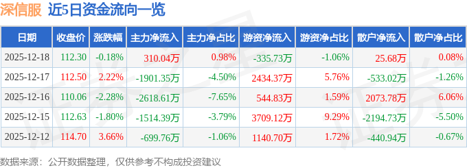 证券之星消息,截至2025年12月18日收盘,深信服(300454)报收于112.3元,下跌0.18%,换手率1.01%,成交量2.79万手,成交额3.15亿元。