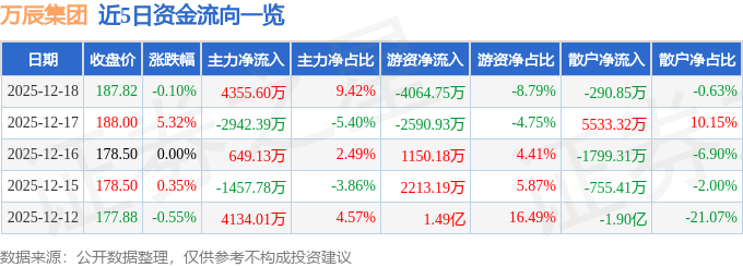 证券之星消息,截至2025年12月18日收盘,万辰集团(300972)报收于187.82元,下跌0.1%,换手率1.45%,成交量2.43万手,成交额4.62亿元。