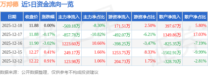 证券之星消息,截至2025年12月18日收盘,万邦德(002082)报收于11.88元,上涨0.0%,换手率1.04%,成交量5.77万手,成交额6854.56万元。