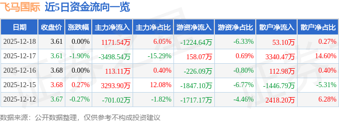 证券之星消息,截至2025年12月18日收盘,飞马国际(002210)报收于3.61元,上涨0.0%,换手率2.0%,成交量53.15万手,成交额1.93亿元。