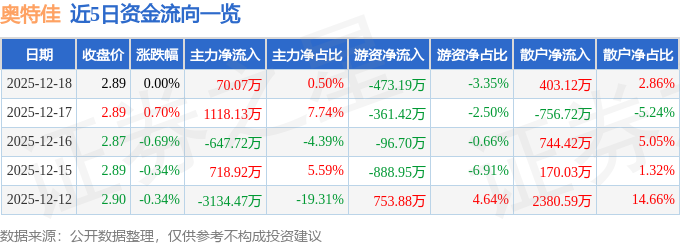 证券之星消息,截至2025年12月18日收盘,奥特佳(002239)报收于2.89元,上涨0.0%,换手率1.49%,成交量48.59万手,成交额1.41亿元。