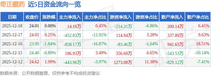 证券之星消息,截至2025年12月18日收盘,奇正藏药(002287)报收于24.01元,上涨0.0%,换手率0.23%,成交量1.3万手,成交额3121.8万元。