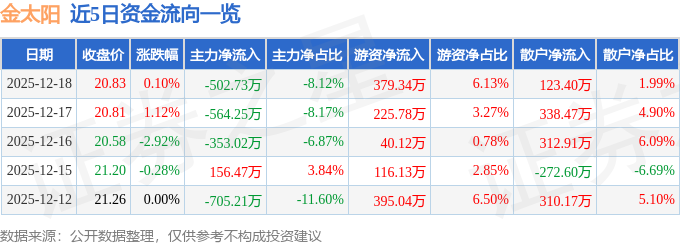 12月18日的资金流向数据方面,主力资金净流出502.73万元,占总成交额8.12%,游资资金净流入379.34万元,占总成交额6.13%,散户资金净流入123.4万元,占总成交额1.99%。