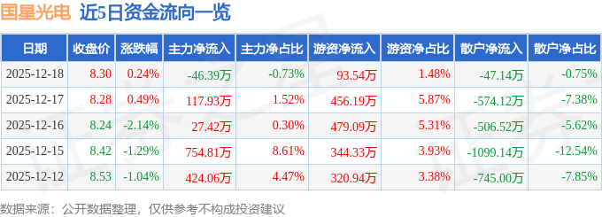 证券之星消息,截至2025年12月18日收盘,国星光电(002449)报收于8.3元,上涨0.24%,换手率1.23%,成交量7.6万手,成交额6322.67万元。