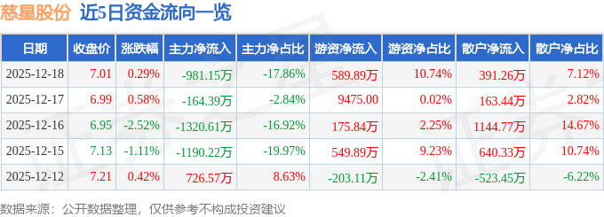 证券之星消息,截至2025年12月18日收盘,慈星股份(300307)报收于7.01元,上涨0.29%,换手率1.0%,成交量7.83万手,成交额5493.48万元。