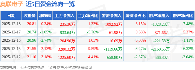 证券之星消息,截至2025年12月18日收盘,奥联电子(300585)报收于20.81元,上涨0.34%,换手率4.97%,成交量8.5万手,成交额1.78亿元。