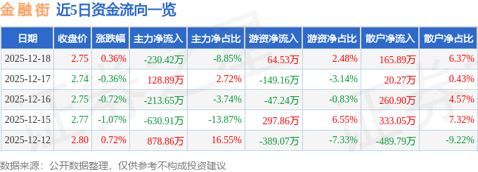 证券之星消息,截至2025年12月18日收盘,金 融 街(000402)报收于2.75元,上涨0.36%,换手率0.32%,成交量9.47万手,成交额2604.31万元。