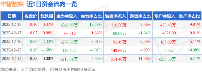 证券之星消息,截至2025年12月18日收盘,华智数媒(300426)报收于8.1元,上涨0.37%,换手率1.35%,成交量5.38万手,成交额4372.23万元。