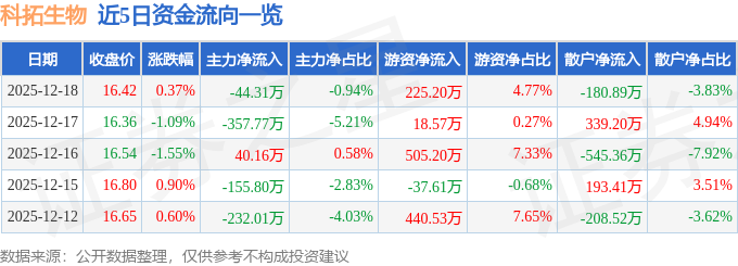 证券之星消息,截至2025年12月18日收盘,科拓生物(300858)报收于16.42元,上涨0.37%,换手率1.48%,成交量2.86万手,成交额4717.29万元。