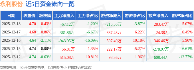 证券之星消息,截至2025年12月18日收盘,永利股份(300230)报收于4.7元,上涨0.43%,换手率1.88%,成交量11.86万手,成交额5587.41万元。