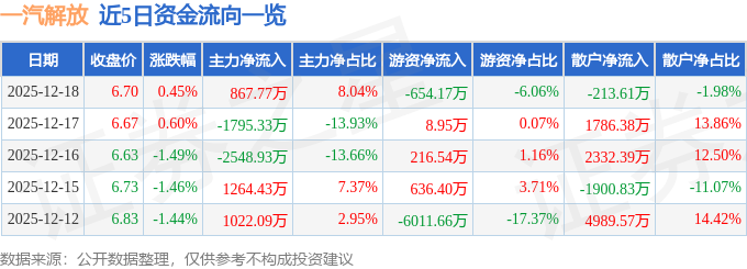 证券之星消息,截至2025年12月18日收盘,一汽解放(000800)报收于6.7元,上涨0.45%,换手率0.33%,成交量16.14万手,成交额1.08亿元。