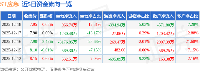 证券之星消息,截至2025年12月18日收盘,ST应急(300527)报收于7.95元,上涨0.63%,换手率0.97%,成交量9.86万手,成交额7851.0万元。