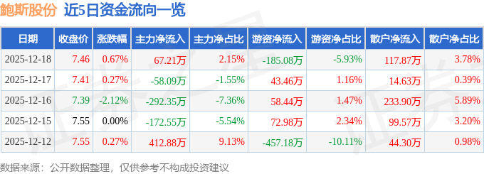 证券之星消息,截至2025年12月18日收盘,鲍斯股份(300441)报收于7.46元,上涨0.67%,换手率0.67%,成交量4.18万手,成交额3119.65万元。