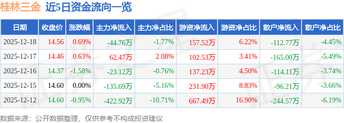 证券之星消息,截至2025年12月18日收盘,桂林三金(002275)报收于14.56元,上涨0.69%,换手率0.31%,成交量1.74万手,成交额2532.97万元。