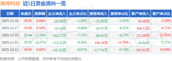 证券之星消息,截至2025年12月18日收盘,凌玮科技(301373)报收于29.85元,上涨0.84%,换手率1.62%,成交量6244.0手,成交额1869.46万元。