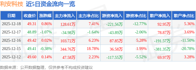 证券之星消息,截至2025年12月18日收盘,利安科技(300784)报收于49.31元,上涨0.86%,换手率2.08%,成交量3514.0手,成交额1735.29万元。