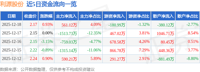 证券之星消息,截至2025年12月18日收盘,利源股份(002501)报收于2.17元,上涨0.93%,换手率1.78%,成交量62.97万手,成交额1.37亿元。