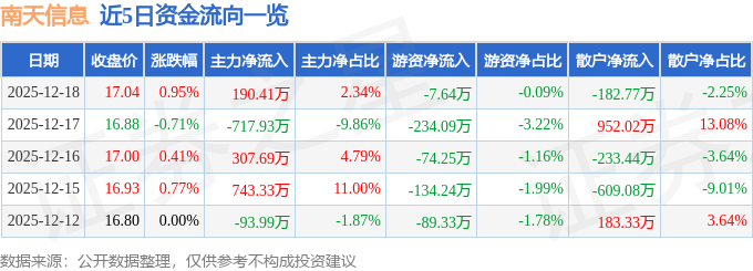 证券之星消息,截至2025年12月18日收盘,南天信息(000948)报收于17.04元,上涨0.95%,换手率1.22%,成交量4.74万手,成交额8120.8万元。