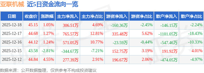 12月18日的资金流向数据方面,主力资金净流入306.51万元,占总成交额4.69%,游资资金净流出160.36万元,占总成交额2.45%,散户资金净流出146.15万元,占总成交额2.24%。