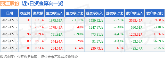 证券之星消息,截至2025年12月18日收盘,丽江股份(002033)报收于9.31元,上涨1.31%,换手率3.48%,成交量19.13万手,成交额1.78亿元。