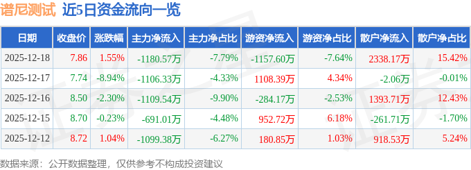证券之星消息,截至2025年12月18日收盘,谱尼测试(300887)报收于7.86元,上涨1.55%,换手率5.31%,成交量19.23万手,成交额1.52亿元。