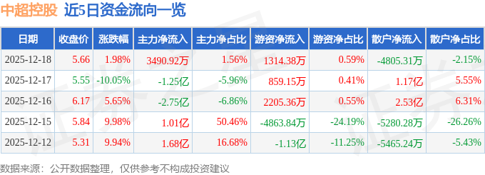 证券之星消息,截至2025年12月18日收盘,中超控股(002471)报收于5.66元,上涨1.98%,换手率29.62%,成交量395.53万手,成交额22.35亿元。