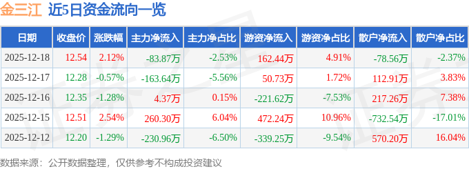 证券之星消息,截至2025年12月18日收盘,金三江(301059)报收于12.54元,上涨2.12%,换手率1.28%,成交量2.64万手,成交额3311.09万元。