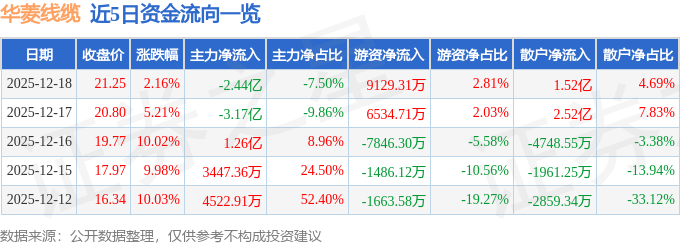 证券之星消息,截至2025年12月18日收盘,华菱线缆(001208)报收于21.25元,上涨2.16%,换手率57.33%,成交量151.01万手,成交额32.49亿元。