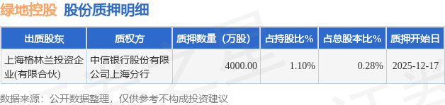 证券之星消息,绿地控股(600606)12月19日公开信息显示,股东上海格林兰投资企业(有限合伙)向中信银行股份有限公司上海分行合计质押4000.0万股,占总股本0.28%。质押详情见下表: