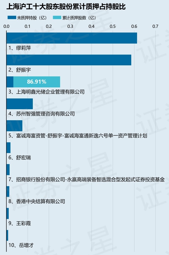 截止本公告日,股东上海明鑫光储企业管理有限公司已累计质押股份2200.0万股,占其持股总数的86.91%。本次质押后上海沪工十大股东的累计质押股份占持股比例(占持股比例的计算以公司最新一期财务报表公布的十大股东的持股总数为基准)见下图: