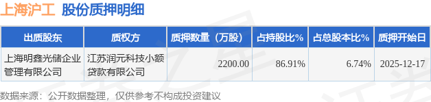 证券之星消息,上海沪工(603131)12月19日公开信息显示,股东上海明鑫光储企业管理有限公司向江苏润元科技小额贷款有限公司合计质押2200.0万股,占总股本6.74%。质押详情见下表: