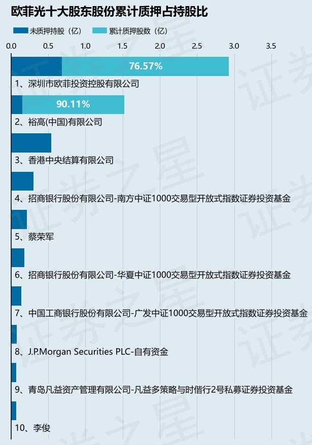 截止本公告日,股东深圳市欧菲投资控股有限公司已累计质押股份2.24亿股,占其持股总数的76.57%,股东裕高(中国)有限公司已累计质押股份1.37亿股,占其持股总数的90.11%。本次质押后欧菲光十大股东的累计质押股份占持股比例(占持股比例的计算以公司最新一期财务报表公布的十大股东的持股总数为基准)见下图: